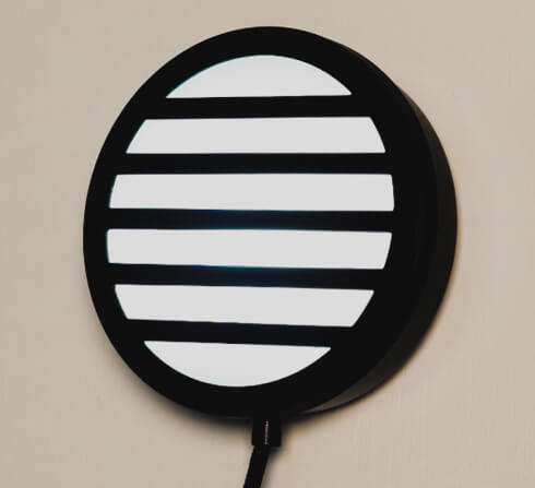 El difusor de esta lámpara es una combinación de lo táctil y lo visual, de lo positivo y negativo. Mientras líneas de luz se escapan con sutileza, las rejitas dejan marcadas líneas de oscuridad formando una especie de ying yang lineal.