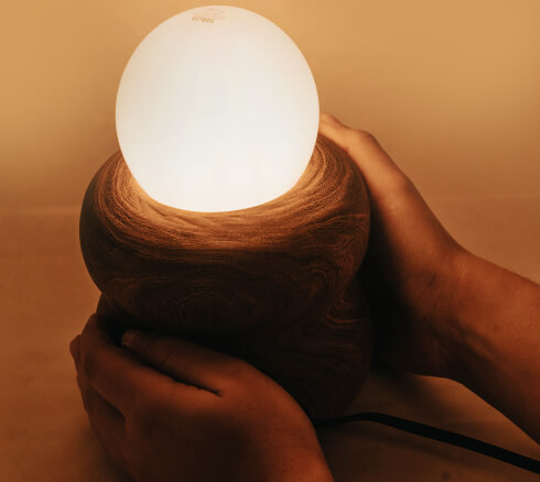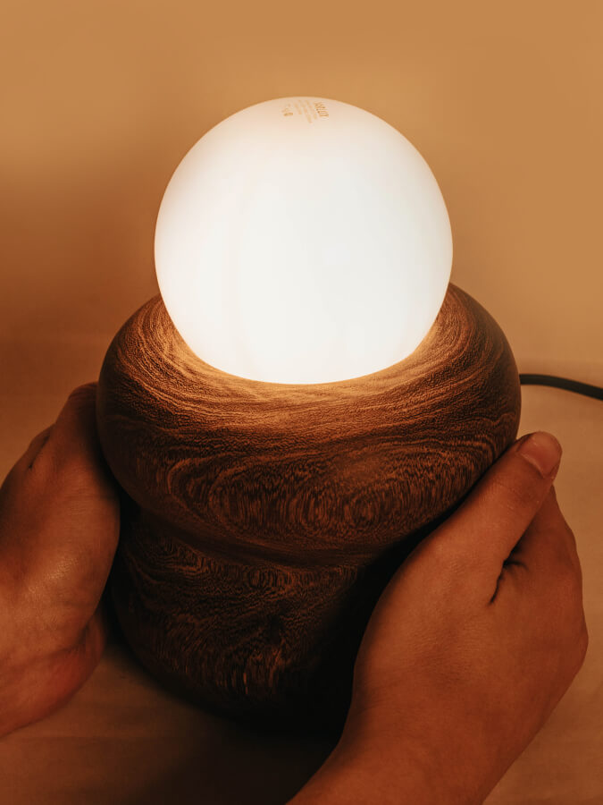 Quisimos hacer una lámpara que otorgue sensaciones de armonia y protección. Así fue como apareció ésta forma. Materiales naturales como la madera de tala urbana y el cuidado de un artesano que, aunque respete las curvas proyectadas en el plano, manipula libremente su técnica, haciendo perfecta y única cada pieza.